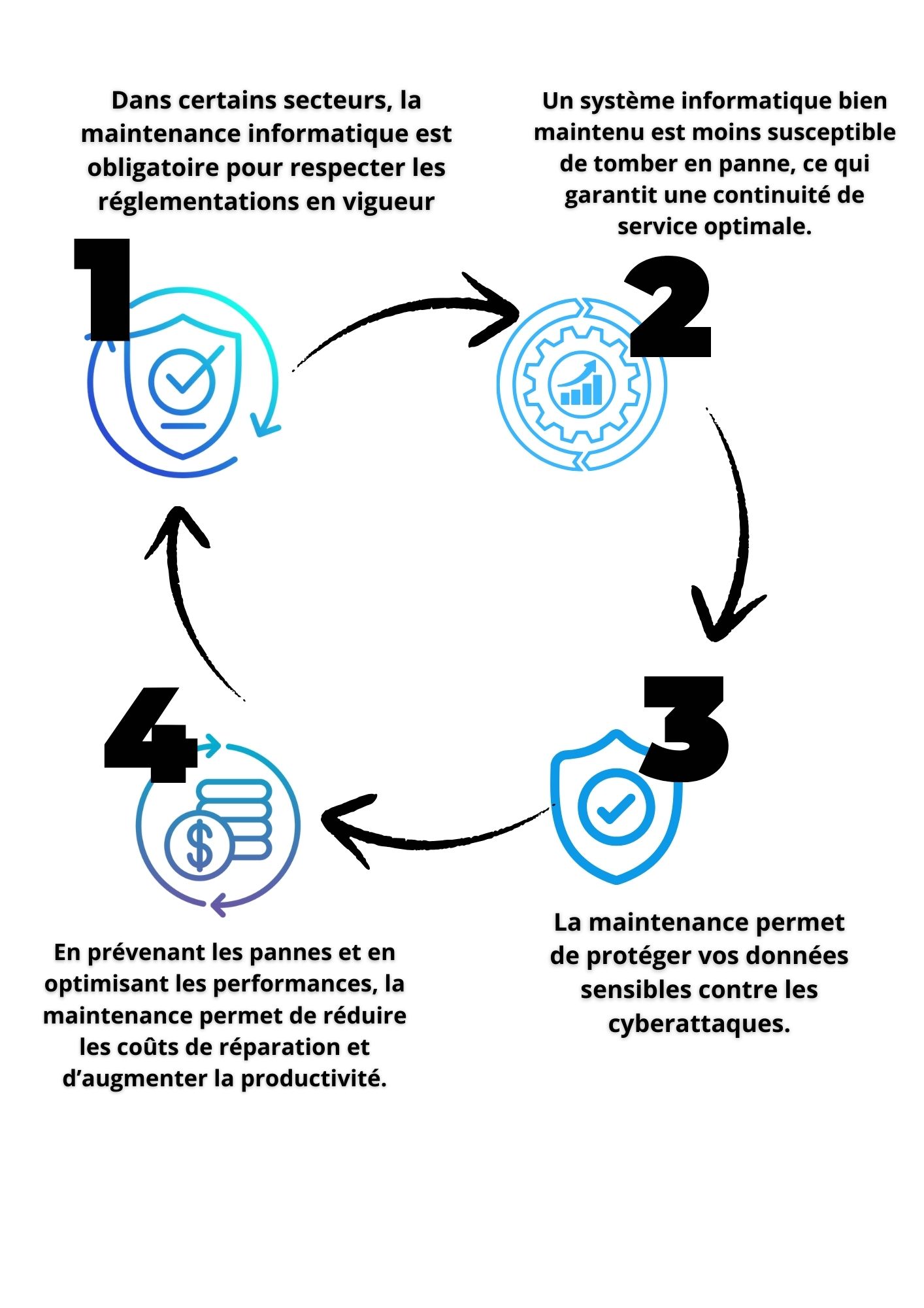 La maintenance informatique est un processus essentiel pour assurer la longévité, la performance et la sécurité de vos systèmes informatiques. Elle consiste en un ensemble d’actions visant à prévenir les pannes, optimiser les performances et protéger vos données contre les menaces cybernétiques.